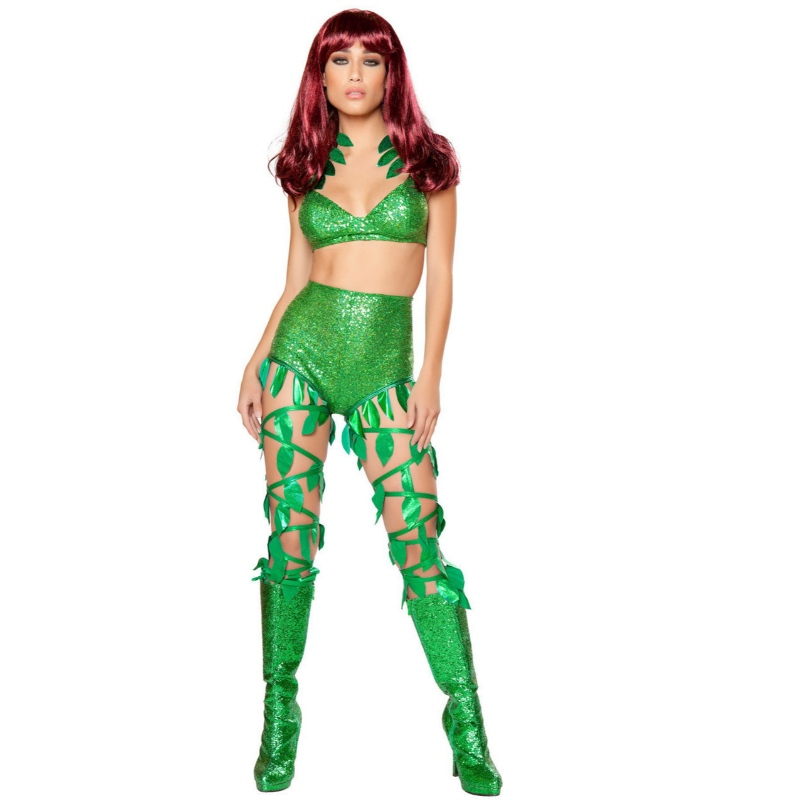 Тези две.-Костюмът включва зелен сутиен от пайети с каишки, детайл от листа, гърба на куката и съответстващо дъно с висока талия с листна украса. (Перуките и обвивките за крака не са включени.)